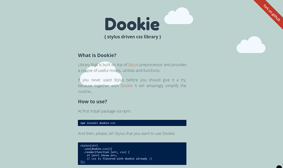 Library that is built on top of Stylus preprocessor and provides a couple of useful mixins, utilities and functions. If you never used Stylus before you should give it a try, because together with Dookie it will amazingly simplify the routine...
