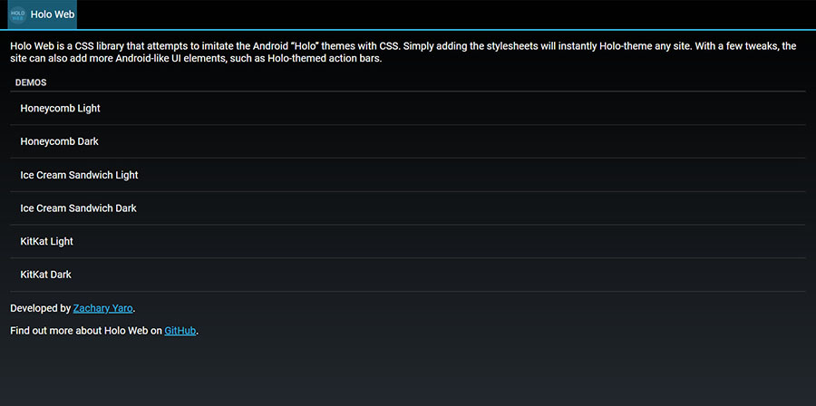 Holo Web is a CSS library that attempts to imitate the Android “Holo” themes with CSS. Simply adding the stylesheets will instantly Holo-theme any site. With a few tweaks, the site can also add more Android-like UI elements, such as Holo-themed action bars.