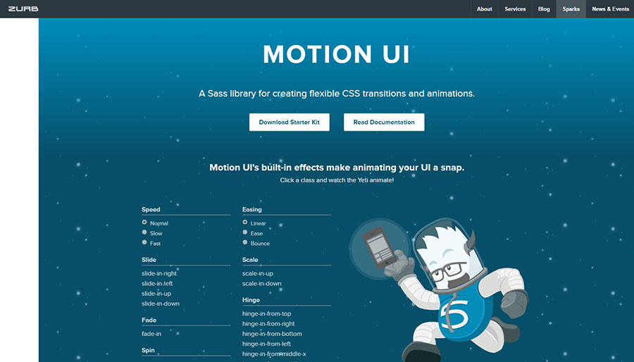 Motion UI is a Sass library for quickly creating CSS transitions and animations. We originally bundled this code with Foundation for Apps, but we've souped it up, made it its own library, and open sourced it ahead of the launch of Foundation for Sites 6.