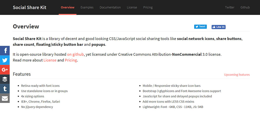 Social Share Kit is a library of decent and good looking CSS/JavaScript social sharing tools like social network icons, share buttons, share count, floating/sticky button bar and popups.